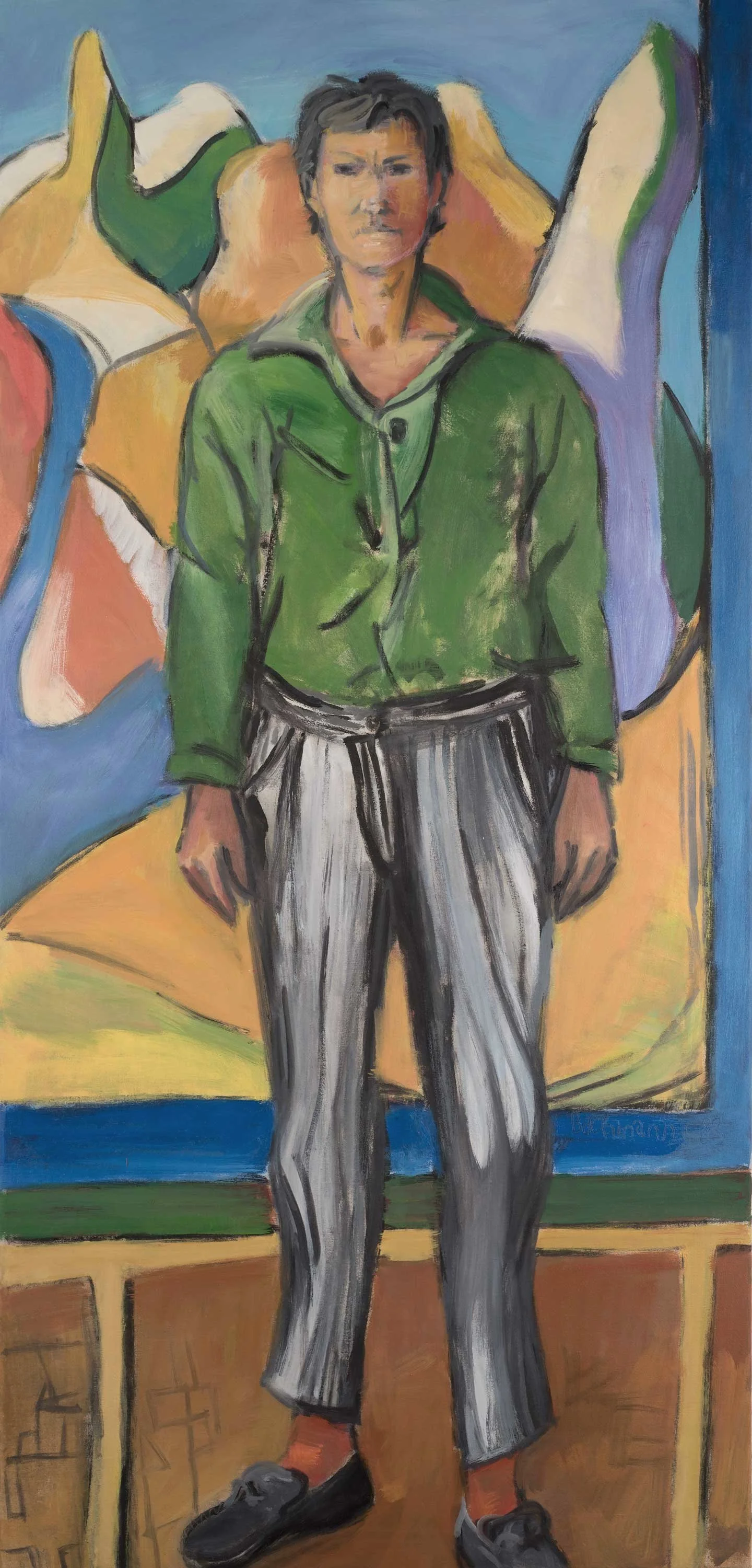 "Selbstbildnis mit Bergenbild", 1983, oil on canvas , 150×71cm, CHF 4200.-